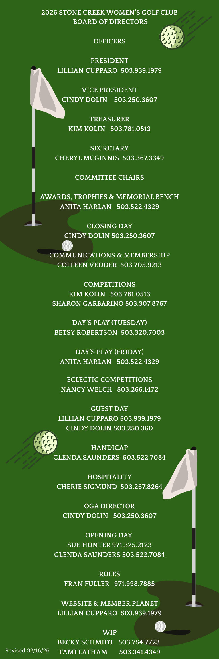 Stone Creek Women's Club welcomes into its membership women golfers who have a GHIN handicap index no higher than 38.2 (equivalent to a Stone Creek Course handicap of 40). Golfers who do not have a GHIN number may qualify for membership by submitting at least three attested 18 hole scorecards for rounds completed on rated courses.