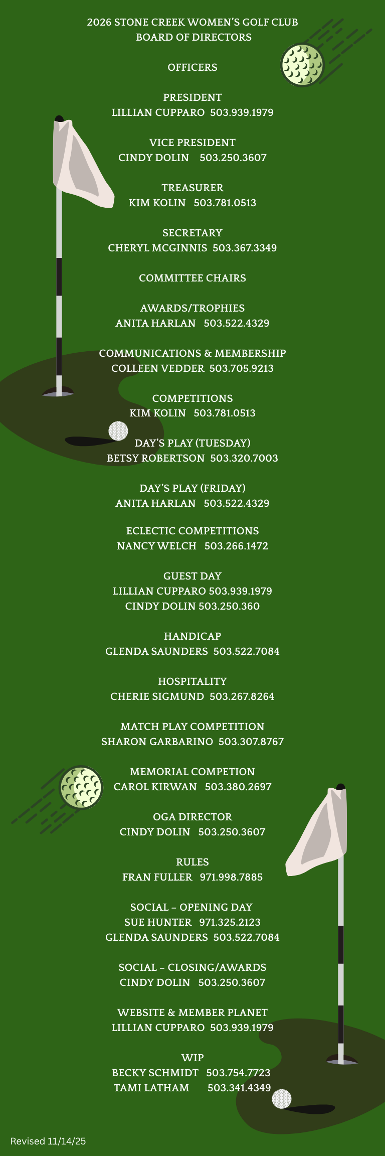 Stone Creek Women's Club welcomes into its membership women golfers who have a GHIN handicap no higher than 38.2 (equivalent to 40 at Stone Creek). Golfers who do not have a GHIN number may qualify for membership by submitting at least three attested 18 hole scorecards for rounds completed on rated courses.